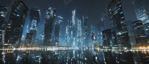 city, skyscraper, night, futuristic, metropolis, neon, light, urban, modern, architecture, building, technology, city landscape, water, dark, blue, digital, illustration, science fiction, science, fiction, glow, illuminated, steel, glasses, tower, structure, industrial, landscape, future, nightlife, scene, view, panorama, amazing, fantastic, awesome