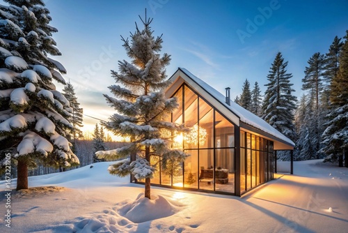 Futuristic Minimalist Winter House with Snowy Pine Tree Landscape | Modern Architecture Design
