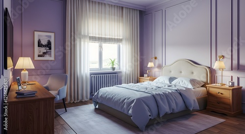 Futuristic Modern Bedroom Interior in Skyscraper - 2030 Trending Color Scheme for Business & Banners.