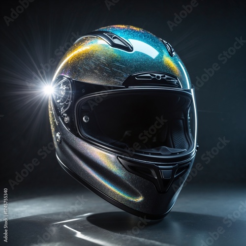 motorcycle helmet, iridescent, shiny, racing, protective, visor, aerodynamic, safety-gear, high technology, metallic, sparkling, futuristic, lens flare, modern, glossy, closeup, black background, sport, biker, road, innovation, sleek, fashion, hard-wearing, automotive, advanced, stylish