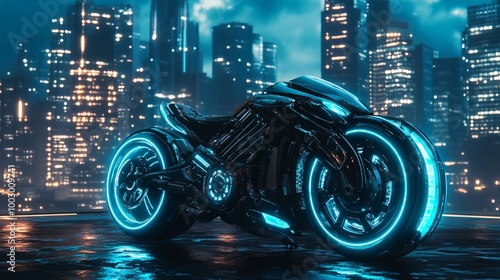 Futuristic motorcycle with glowing blue rims parked in front of a city skyline at night.