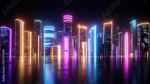 Futuristic neon cityscape at night with vibrant colors and reflections