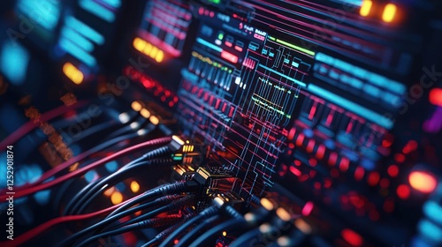 server, technology, digital, computer, network, cable, datum, circuit, code, screen, interface, light, red, blue, colourful, graphic, display, information, innovation, future, modern, abstract, visualisation, glowing, energetic, powerful, closeup, detail, hardware, electronic, wire, connection, system