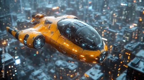 spaceship, futuristic, orange, vehicle, city, city landscape, flying, aircraft, transportation, technology, science, fiction, urban, building, scene, design, render, three-dimensional, model, art, graphic, illustration, digital, concept, light, night, speed, motion, travel, journey, adventure, exploration, spacecraft, glossy, sleek, detail, window, cockpit