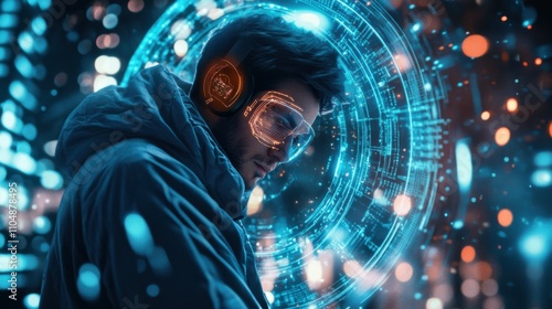 Futuristic Portrait of a Young Man with Headphones and Digital Effects