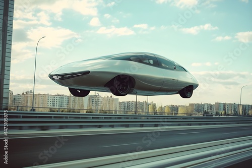 Futuristic retro car without wheels, flying over the streets and highways, very cool atmosphere and retro feeling