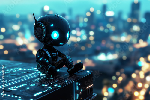 robot, ai, artificial intelligence, android, three-dimensional, technology, computer, cyborg, future, futuristic, city landscape, city, digital display, night, glow, blue, glowing, city life, city street, street scene, surreal, imagination, dreamlike, bright, fantasy, innovation, computer graphic, neon sign, brightly lit, dusk, electrification, concept, creative, background, contemporary, aesthetic, cute
