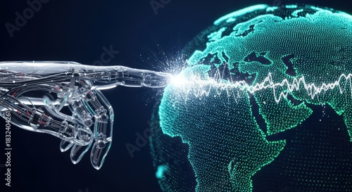 Futuristic robot hand interacts with a digital Earth creating a pulse of connection and advanced technology integration for a globalized world