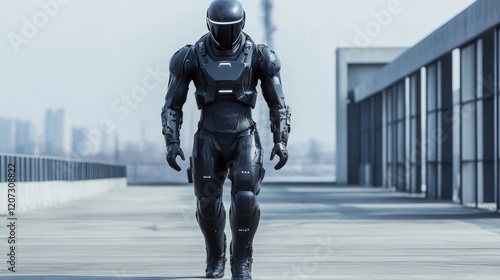 robot, cyborg, futuristic, armoring, soldier, urban, city, landscape, technology, science, fiction, future, walking, suit, helmet, dark, grey, black, modern, building, steel, metal, artificial, intelligence, android, machine, digital, realistic, advanced, powerful, strong, combat, security, protection, weapon, war, battle, military, industrial, structure, sky, horizon, day