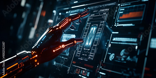 futuristic, robotic, hand, digital, interface, technology, cyber, touch screen, computing, machine, future, ai, automation, cybernetic, tech, contraption, interaction, control, advanced, virtual, screen, panel, science fiction, datum, engineering, innovation, programming, electronic, precision, manipulation