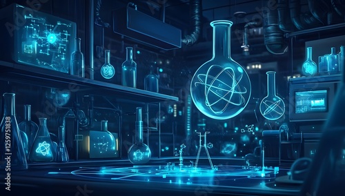 science, laboratory, experiment, futuristic, atomic, research, technology, glowing, beaker, chemistry, beaker, flask, equipment, modern, innovation, dark, blue, light, study, molecular, physics, experimentation, illustration, creative, design, concept, digital, artwork, glow, abstract