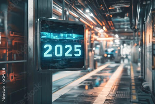 Futuristic setting showcasing a digital display indicating the year 2025 in a high-tech corridor
