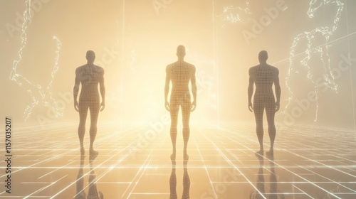 Futuristic silhouettes in glowing environment.