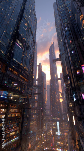 Futuristic skyscraper cityscape at sunset, ultra-detailed, sci-fi architecture, glass buildings, neon lights, wide angle, cinematic lighting, hyper-realistic, no people or animals.