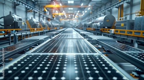 factory, industry, solar, energy, renewable, sustainable, technology, engineering, manufacturing, machinery, automation, production, assembly, warehouse, futuristic, modern, industrial, clean, efficient, environmentally friendly, power, innovation, conveyer, belt, steel, metal, pipe, tube, advanced, robotic, equipment, tool, part, component, future, science, design, architecture, green, eco, concept, efficiency