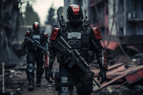 futuristic, soldier, city, red, black, armoring, gun, debris, building, science fiction, war, destruction, technology, robot, military, combat, soldier, transport, weapon, gun, people, police, power, ai