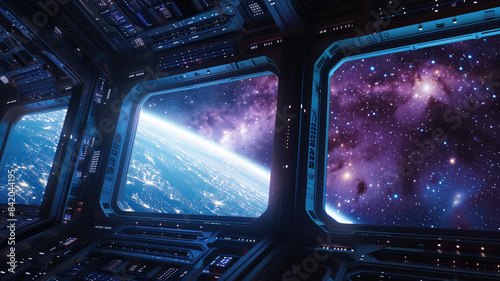 Futuristic Space Station Interior with Sleek Technology and Endless Stars Visible Through the Window, Floating in the Milky Way