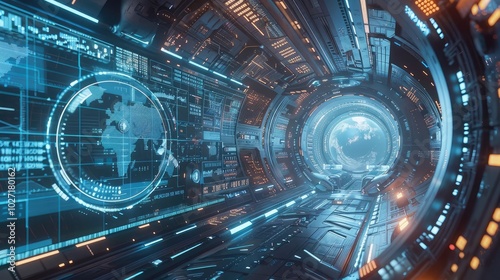 futuristic, space, station, digital, interface, technology, science fiction, corridor, spaceship, interstellar, hybrid, glowing, detailed, earth, world map, high technology, advanced, screen, navigation, exploration, outer space, modern, cyberspace, innovation, interior, cosmic, background, environment, virtual, datum, seamless, engineering, cyber, transport