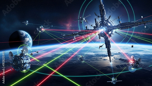 Futuristic space station with satellites and laser beams orbiting earth in a sci fi setting with a large planet in the background and multiple spacecraft connected by lines