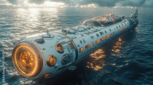 Futuristic submarine vessel gliding on the ocean waves.