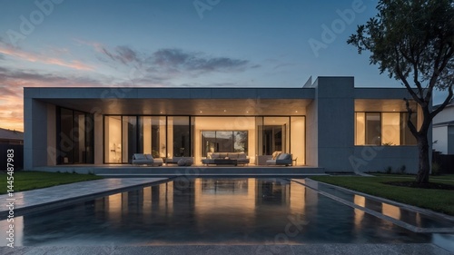 Futuristic suburban luxury house with unique architectural design set against a modern urban landscape and surrounded by vibrant green spaces