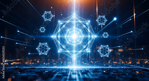 Futuristic technology network with glowing connections and digital elements