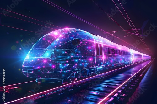 train, futuristic, neon, digital, technology, transportation, railway, glowing, vibrant, abstract, network, light, speed, modern, design, innovation, travel, motion, energy, science fiction, colourful, night, electric, infrastructure, urban, concept, art, illustration, creative, dynamic, line, geometry, connectivity, cyber, aesthetic, visual, scenery, landscape, rail, locomotive, high speed, advanced, sleek, aglow, environment, fantasy, artistic, simulation, three-dimensional