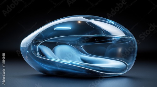 vehicle, futuristic, transparent, transportation, innovation, technology, design, modern, concept, advanced, future, science fiction, egg, pod, car, cabin, interior, blue, light, glowing, mobility, passenger, abstract, clear, smooth, clean, luxury, private, electric, eco, sustainable