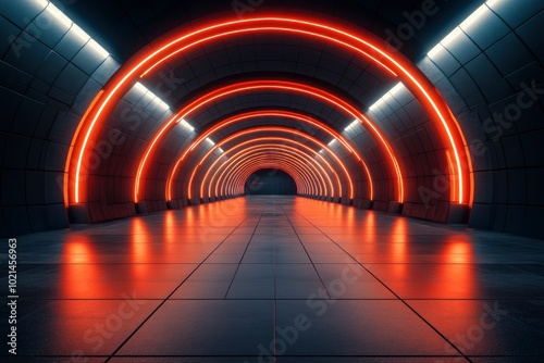 futuristic, tunnel, neon, light, glow, orange, red, bright, illuminated, dark, abstract, architecture, design, modern, contemporary, science, fiction, space, technology, corridor, hallway, passage, entrance, exit, wall, ceiling, floor, tile, pattern, glossy, shiny, perspective, depth, mystery, background, render, three-dimensional, graphic, illustration