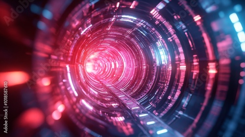 futuristic, tunnel, neon, light, pink, blue, glow, abstract, technology, digital, space, cosmic, vibrant, bright, circular, graphic, design, pattern, texture, shape, line, reflective, glossy, metallic, modern, surreal, perspective, depth, energy, movement, journey, travel