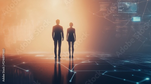 Futuristic view of two individuals in a digital world.