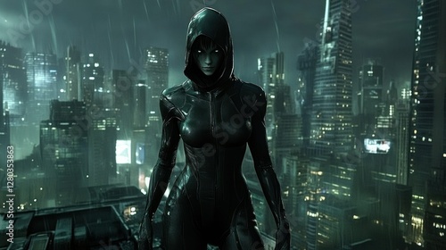 Futuristic vigilante in a sleek suit stands on a rooftop overlooking a neon-lit cityscape at night