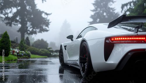 Futuristic white sports car parked on a wet road in a misty forest during the day