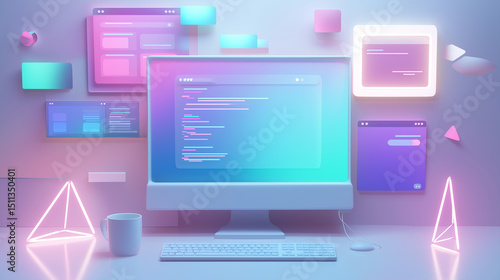computer, coding, programming, neon, pastel, futuristic, workspace, design, development, digital, code, monitor, technology, cyber, screen, keyboard, software, interface, abstract, glowing, holographic, gradient, innovation, science fiction, datum, system, tech, modern, graphic, cyberspace, workstation, developer, visualisation, creative, light, geometric, information technology, desk, colourful, virtual, application, frontend, web design