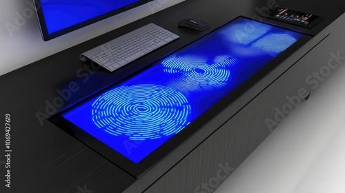 technology, workspace, design, touch screen, modern, office, interactive, blue, furniture, aesthetic, digital, laptop, keyboard, mouse, decor, pattern, innovation, efficiency, equipment, minimalism, productivity, communication, ergonomic, sophistication, contemporary, layout, glare, illumination, structure, multimedia, surface, advanced, connectivity, visual, ambience, creativity, elegance, seamless, user-friendly, setup, visualisation, tech, interface, hardware, arrangement, functionality, sleek, aesthetic