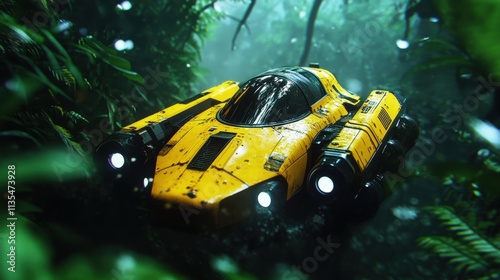 futuristic, vehicle, car, yellow, jungle, rainforest, tropical, foliage, greenery, leaf, plant, nature, exploration, adventure, science fiction, science fiction, retro, vintage, grunge, damaged, worn, offroad, travel, mystery, hidden, secret, night, dark