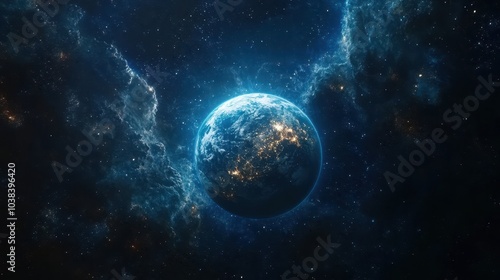 Galactic Wonders: Earth Illuminated in a Celestial Blue Space Background