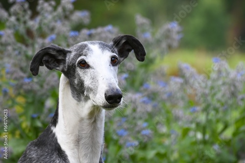 greyhound, dog, flower, flower, flower, pet, summer, plant, garden, outside, portrait, black, white