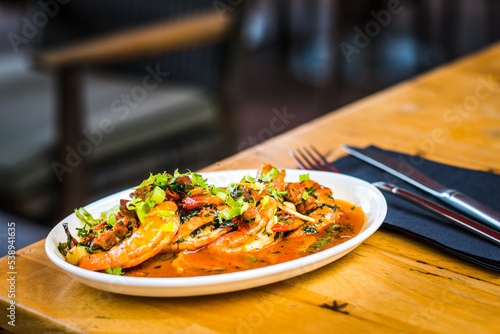 Gambas prawns made from Chilli prawn, garlic, coriander, chorizo