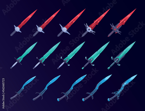Game swords upgrade. Cartoon fantasy weapon equipment degree for gaming UI design, magic medieval battle ammunition force sequence. Vector set