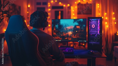 gaming, gamer, computer, technology, earphones, keyboard, screen, monitor, desktop, setup, digital, night time, creativity, entertainment, hobby, home office, relaxation, player, strategy, competitive, adventure, action, fun, solitude, concentration, electronic, glowing, atmosphere, ambient, high technology, modern, futuristic, innovation, virtual