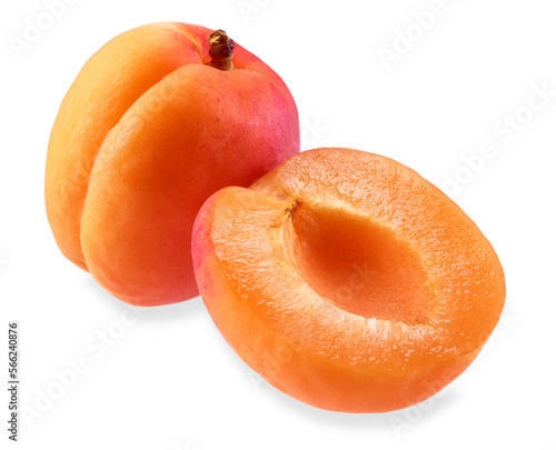Ganze Aprikose mit halber Aprikose auf weissem Fond als Freisteller