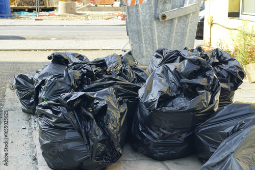 Garbage bags lying near container in city environment. Concepts of waste collection, urban trash disposal, pollution, ecology, environmental issue, sustainability challenge and global consumerism