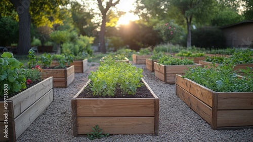 garden, bed, plant, vegetable, herb, growing, wooden, box, dirtied, gravel, path, sunlight, tree, foliage, backyard, nature, outdoors, agriculture, cultivation, crop, greenery, botanical, sustainable, environmentally friendly, rural, farming, organic, horticulture, botany, fresh, green, springtime, summer, harvest, landscaping, gardening, growth, natural, park, home, season, flourishing