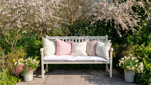 Garden bench with striped pillows, cushioning, and vibrant spring flowers under blooming cherry trees