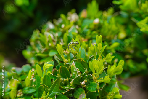 Garden pests.Green caterpillar sits on green boxwood branches.caterpillar moves and eats a boxwood bush. Treating the garden against moth caterpillars.protect garden and ensure the health