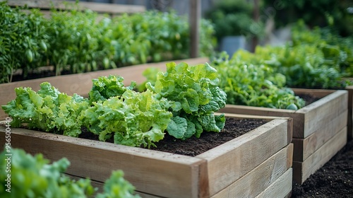 Garden Raised Beds for Growing Vegetables and Herbs on Humus soil Lettuce Salad Cucumbers growing in High Garden Beds Modern Urban Gardening and Community Eco Garden concept : Generative AI