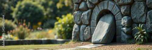 Garden stone archway with a serene mood representing natural beauty against a soft-focused garden background