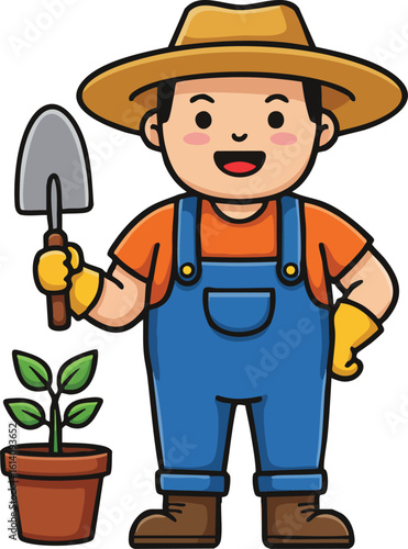 gardener, garden, plant, potted plants, shovel, glove, hat, overall, dirtied, germ bud, farming, nature, growth, agriculture, hobby, tool, men at work, green, earth, environment, cultivation, care, planting, farm, manual labor, character, cartoon, male, person, vector, illustration, activity, happy, smile, crop, germinating, farmer, rural, hobbyist, leisure