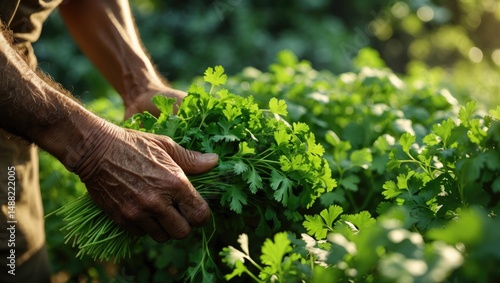 Gardener's hands gather parsley crop in the garden. Farming tasks. Collection and nutritious organic food idea in close-up with selective focus.